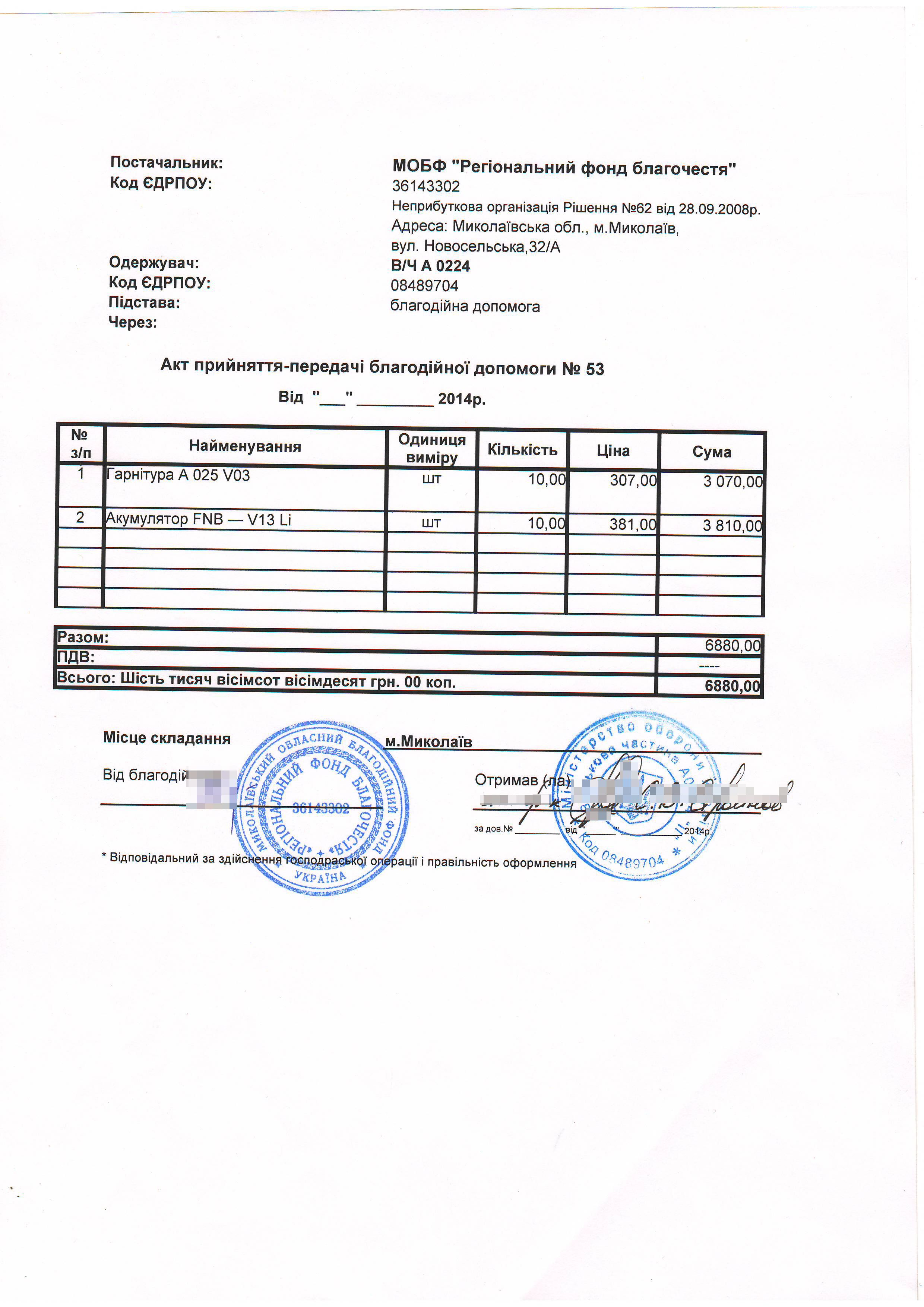 | 01/07/14 | 21700 UAH | спонсорська допомога | |