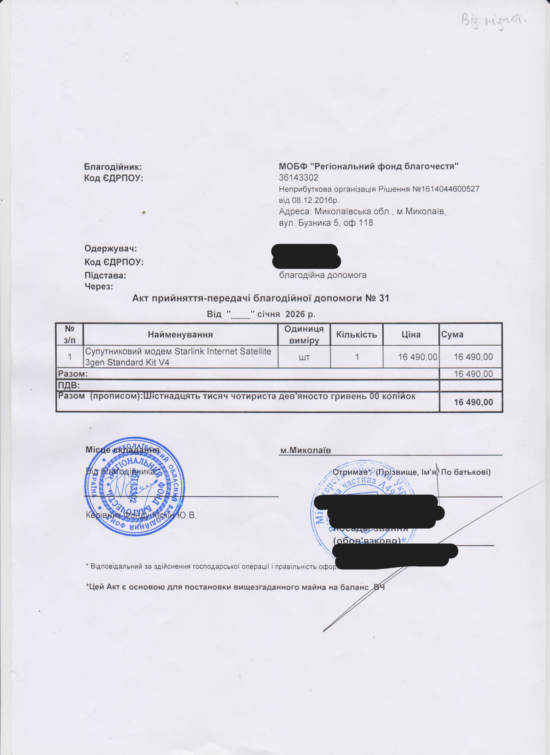 | 19/02/2026 | Starlink mini. Generator | 2 | 29 364.05 | waiting act |