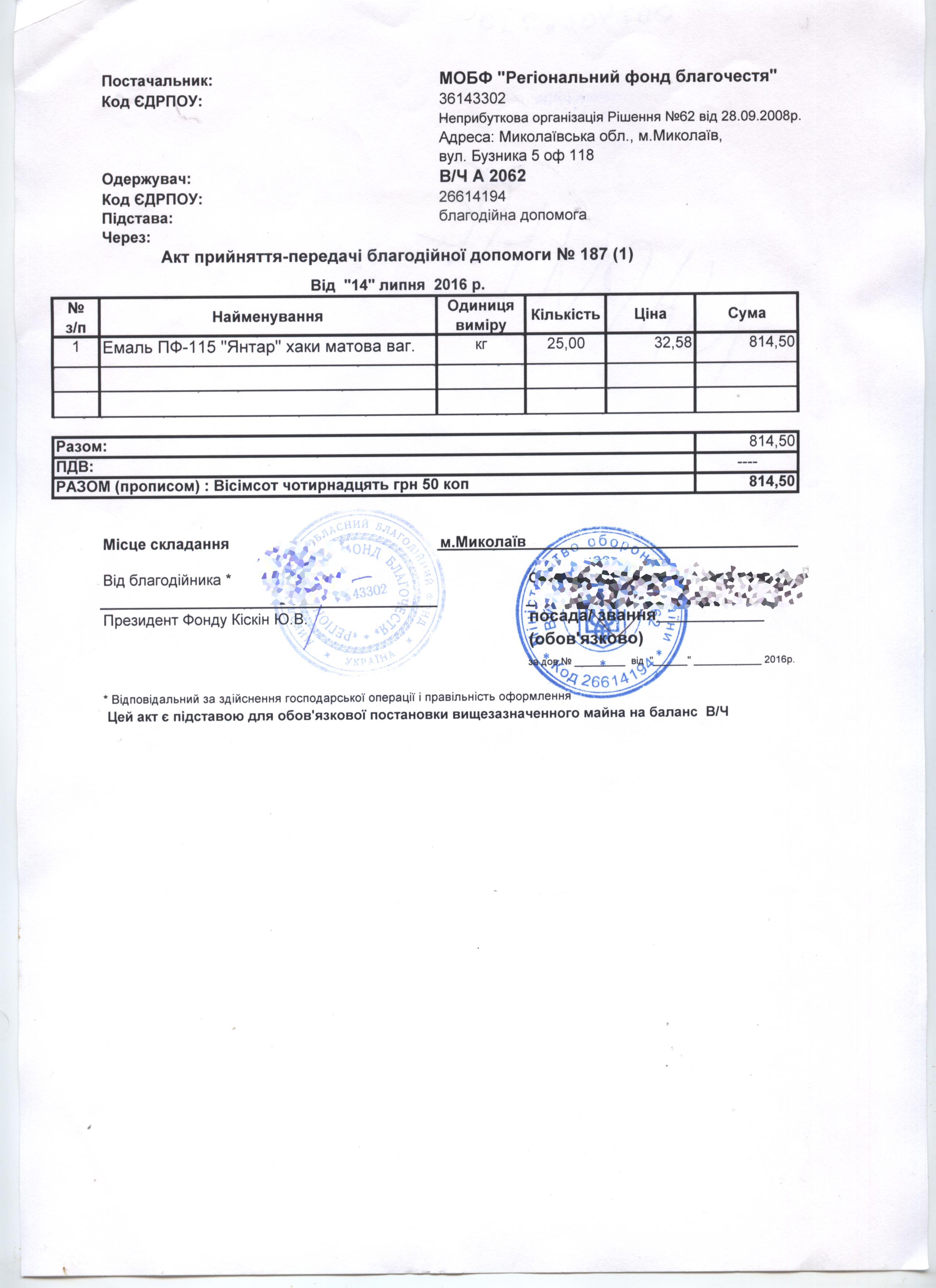 | 30/03/2016 | Metal, enamel and suplies | -- | 16 425.22 | delivered to military unit А0224 |