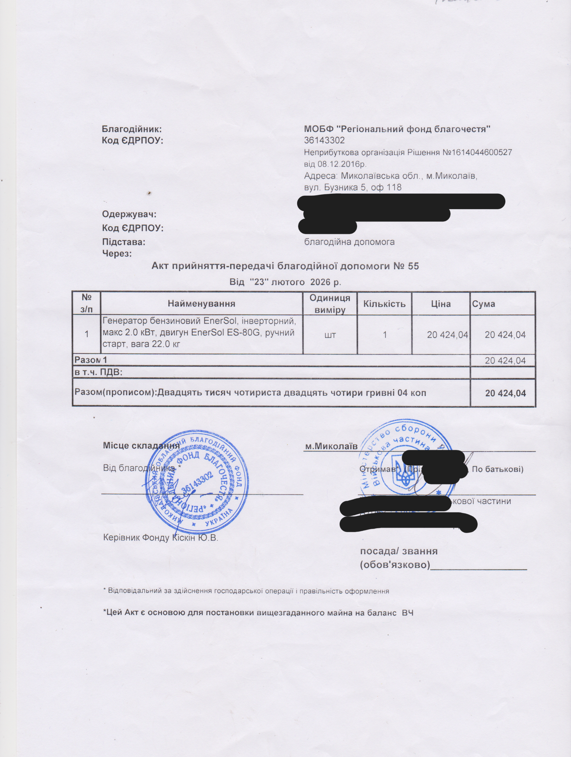 23/02/2026Бензиновий генератор 1 18 600.00Акт