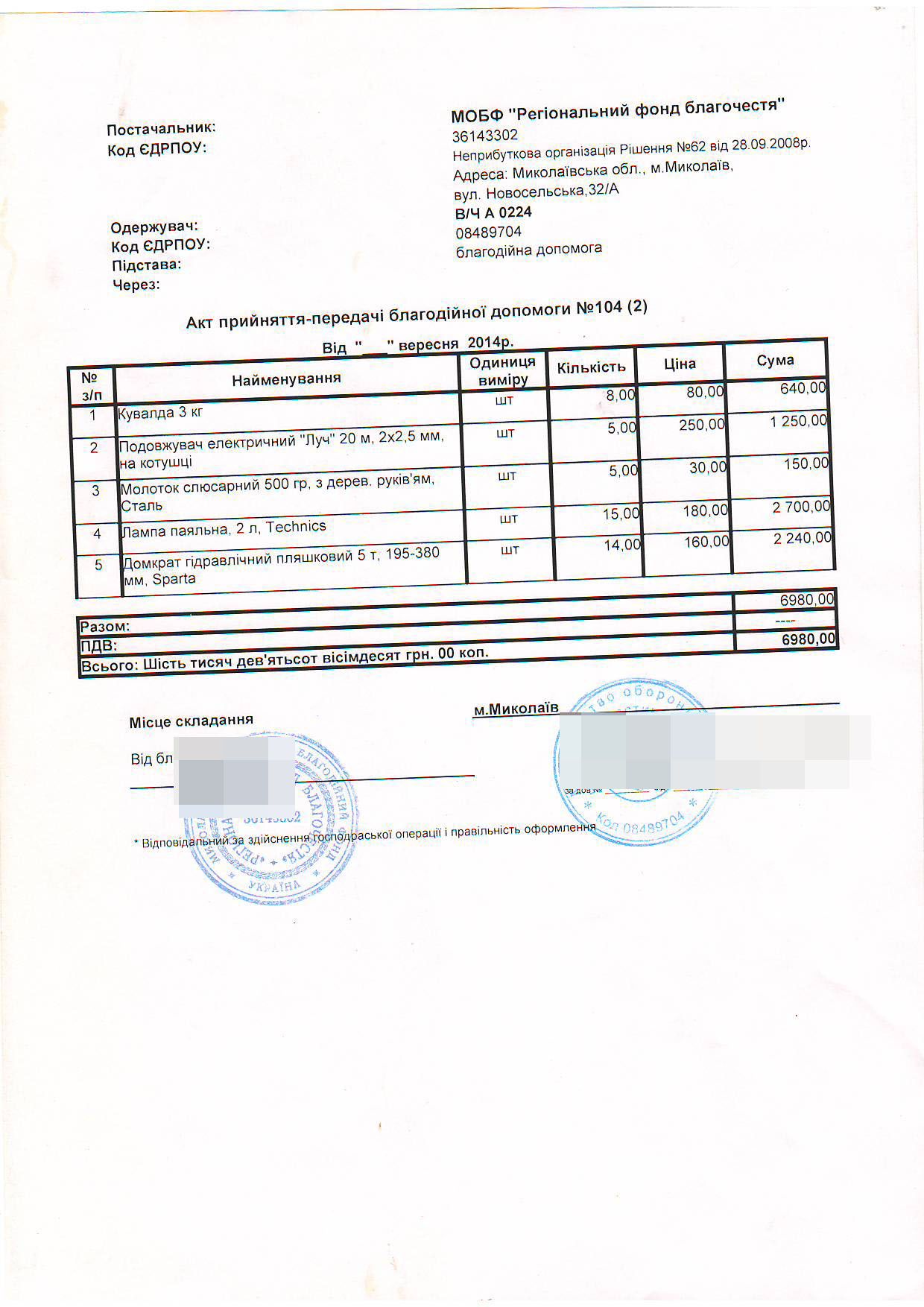 | 04/09/2014 | Кувалда 3 кг, Україна | 8 | 640.00 | передали до в/ч А 0224 |