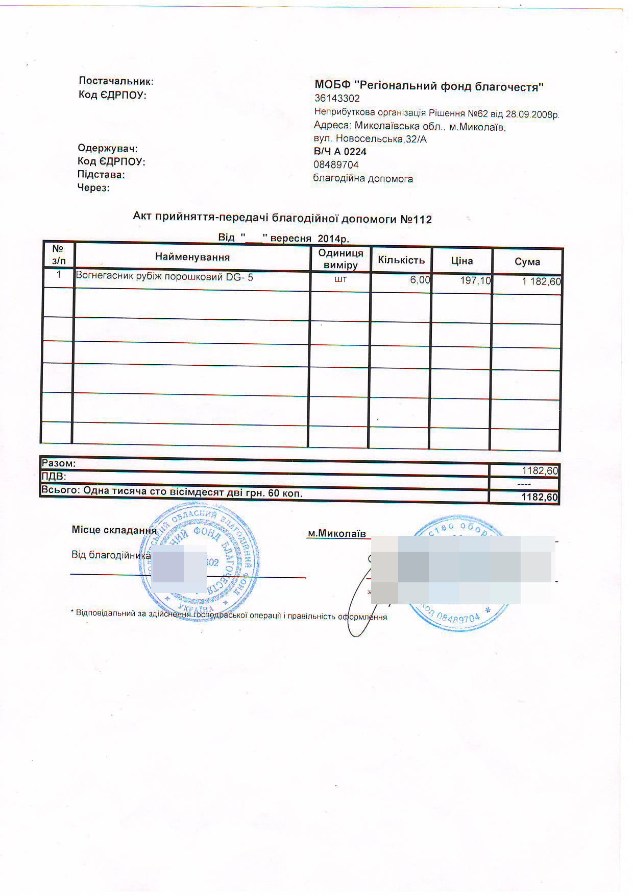 | 04/09/2014 | Вогнегасник Рубіж порошковий ВП-5 | 6 | 1 182.60 | передали до в/ч А 0224 |