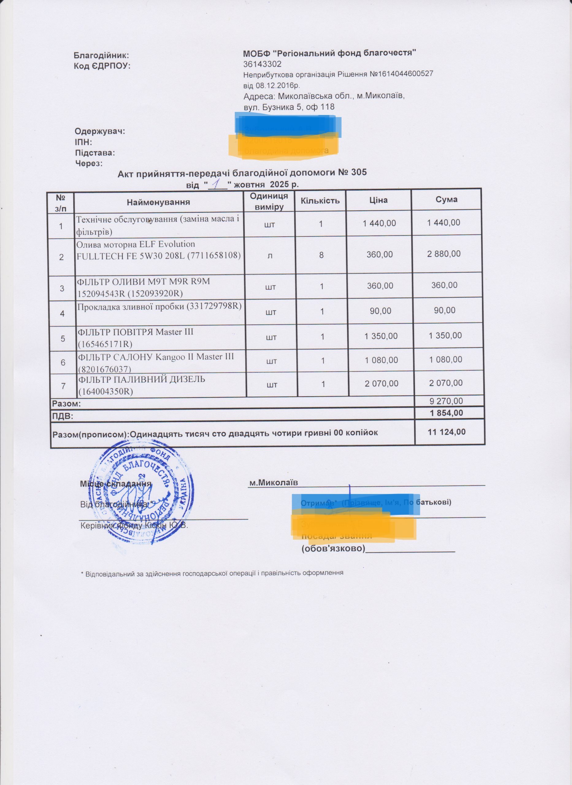 | 18/11/2025 | ТО+витратні матеріали | 14 | 11 124.00 | Акт |