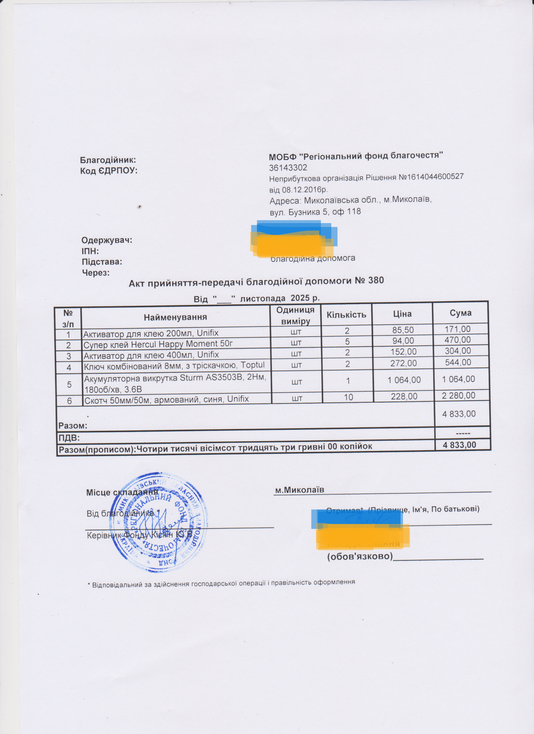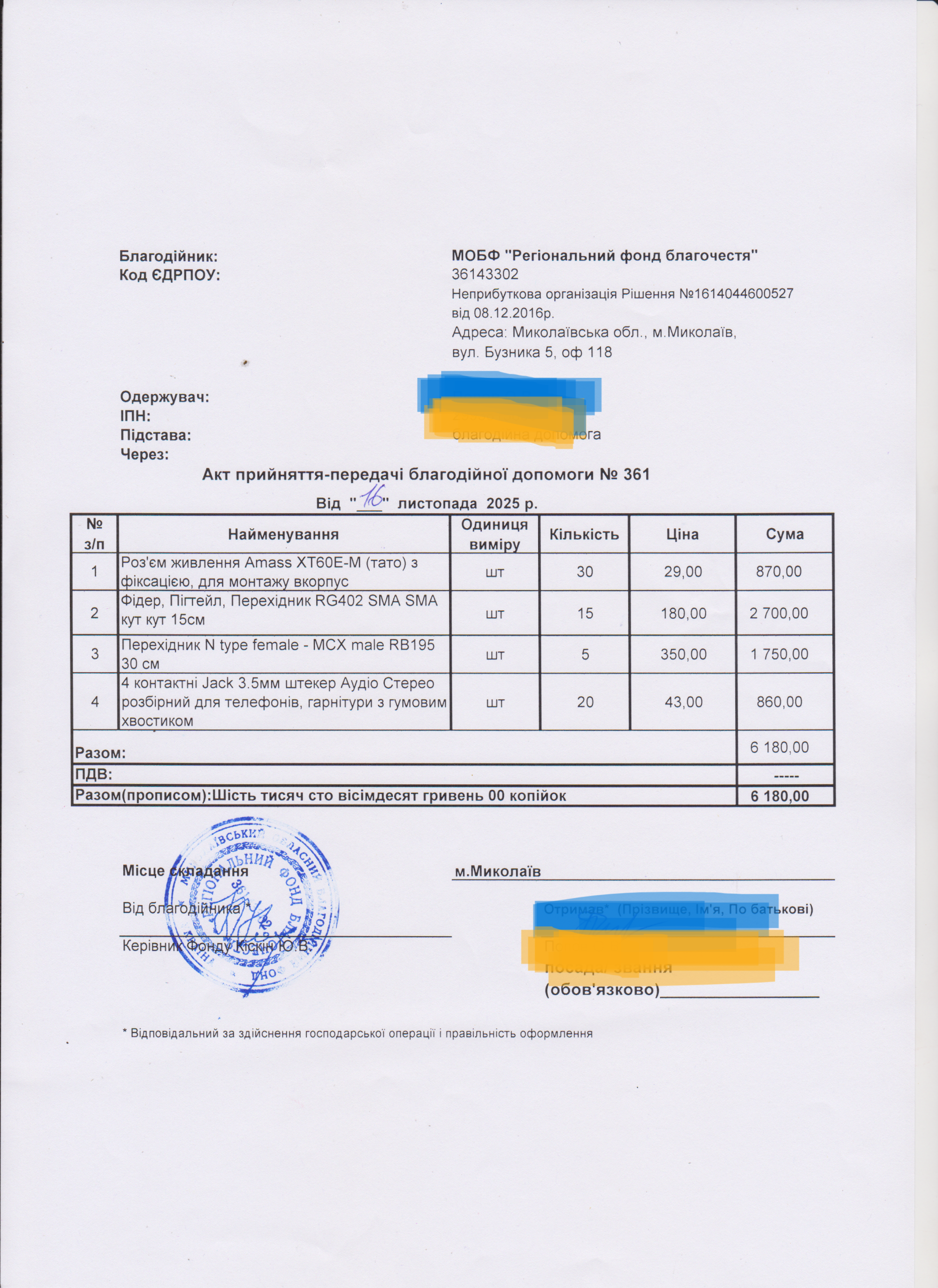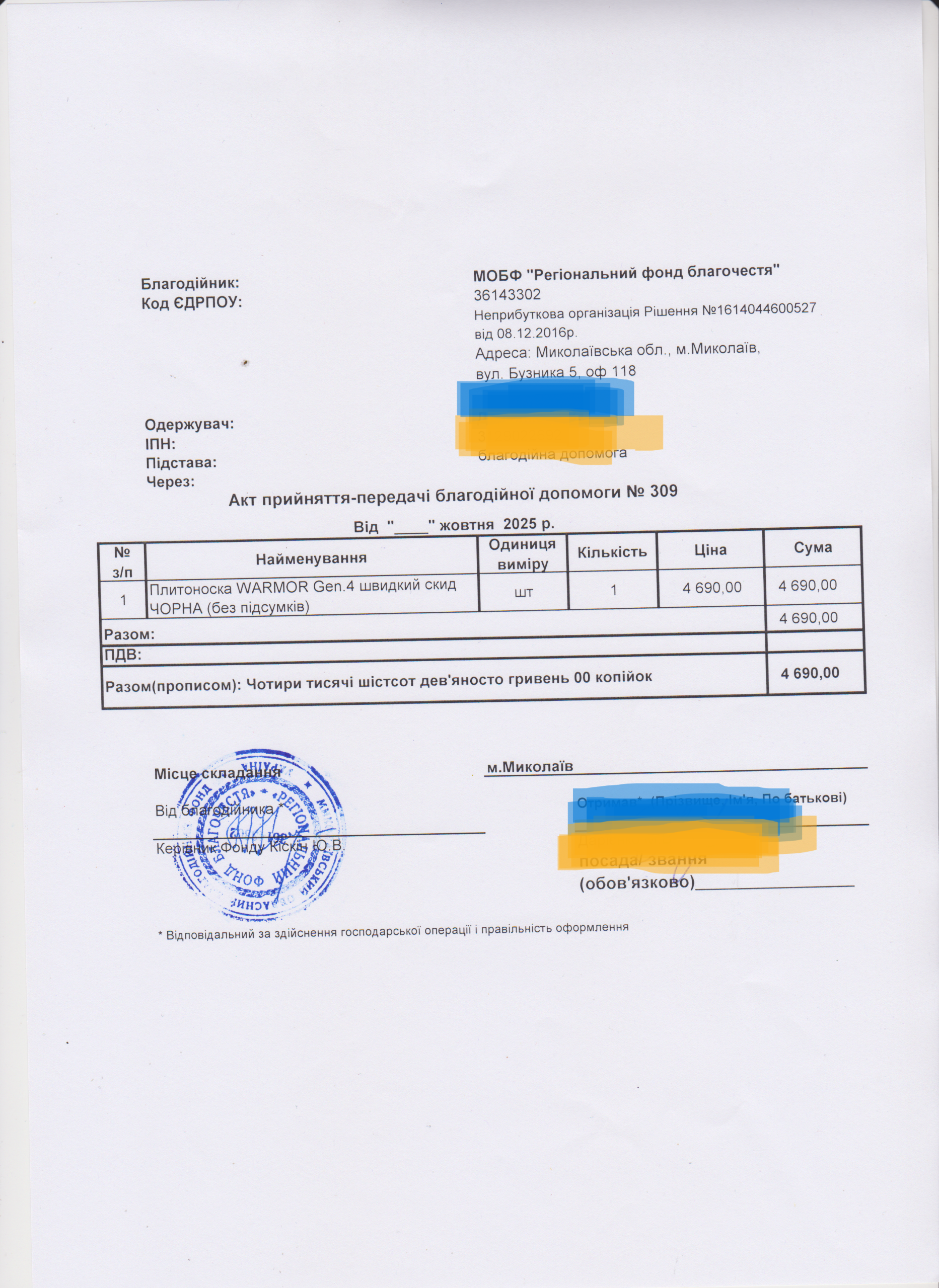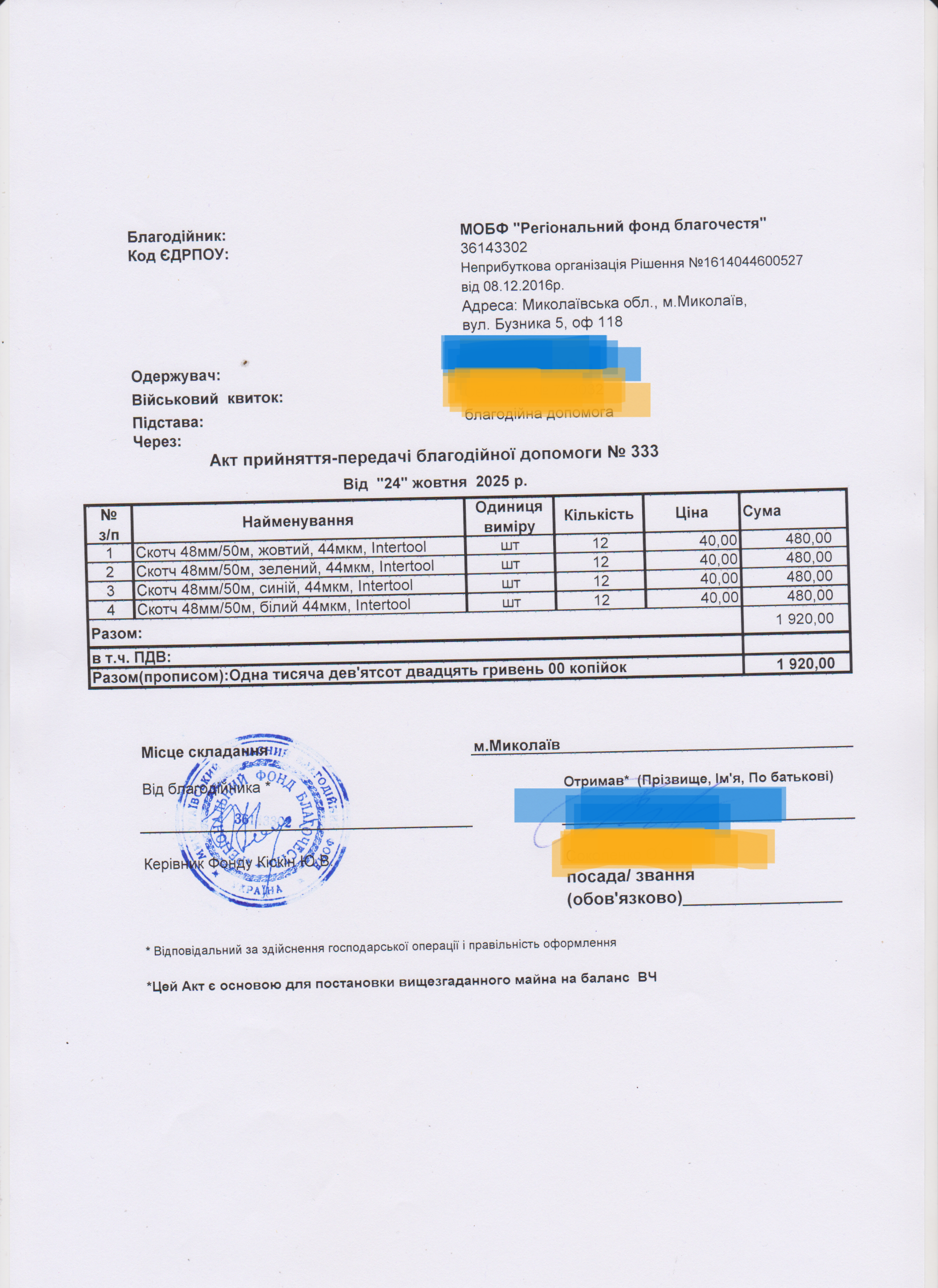 | 11/04/2024 | бронежилет | 1 | 12 850.00 | закуплено та передано |