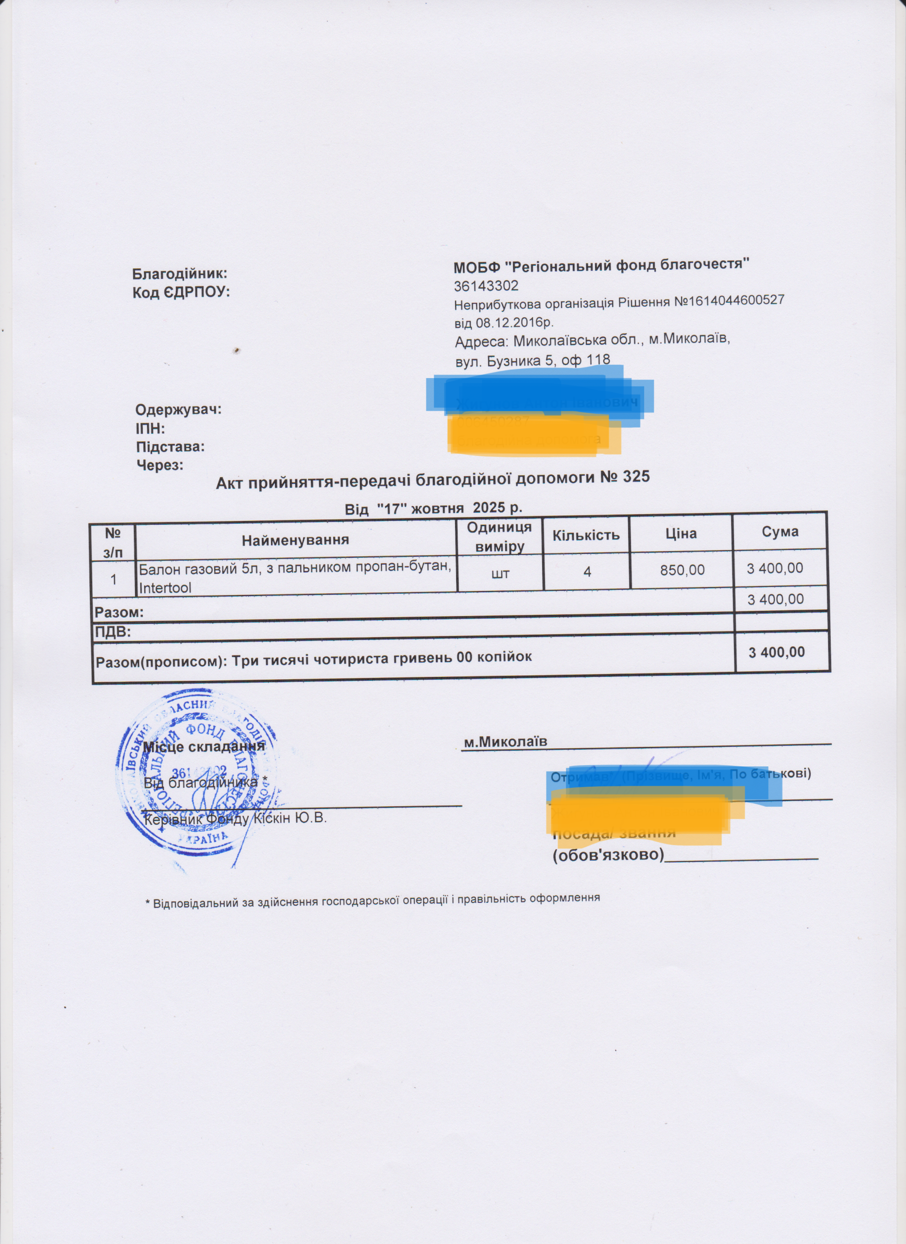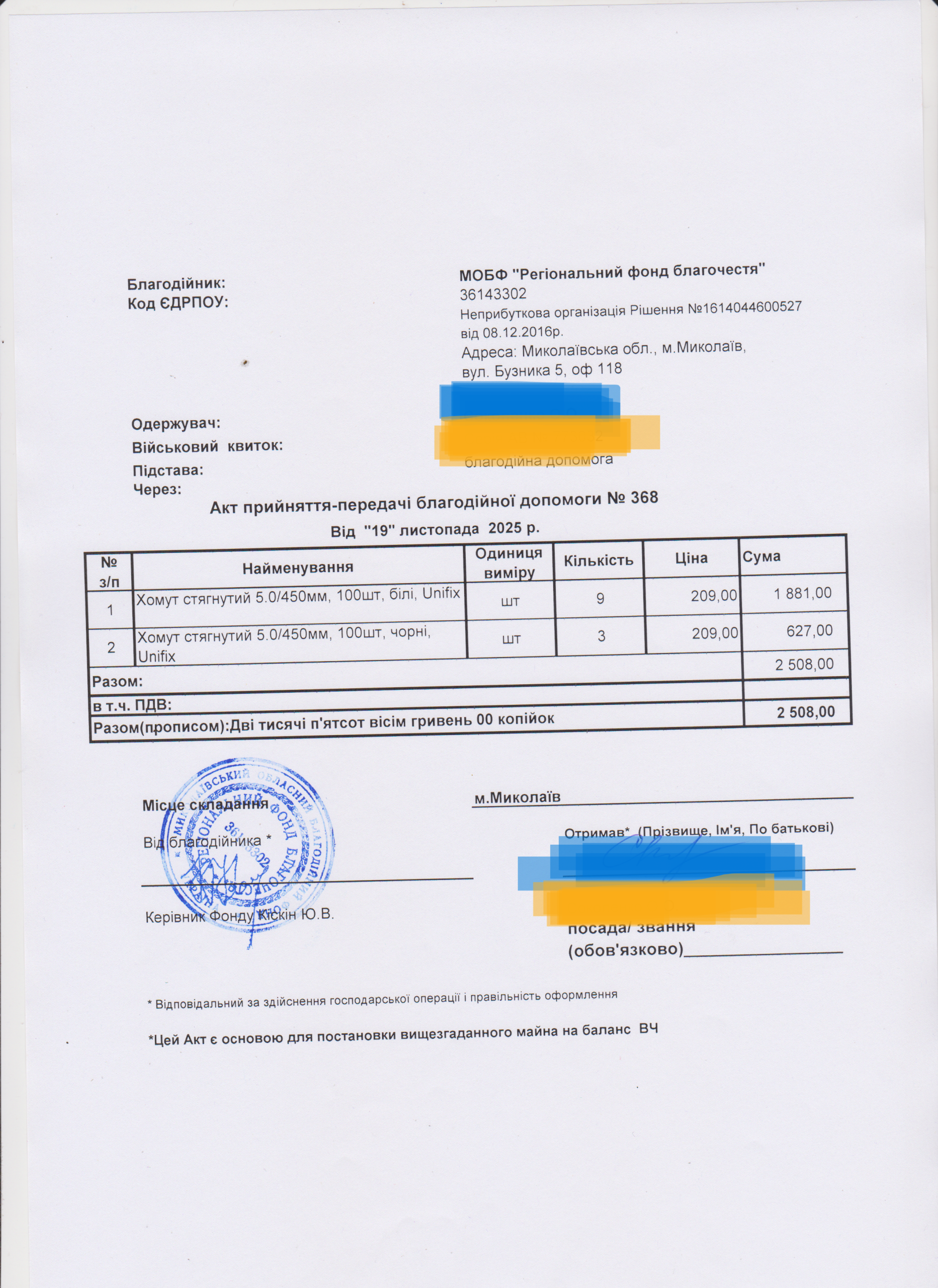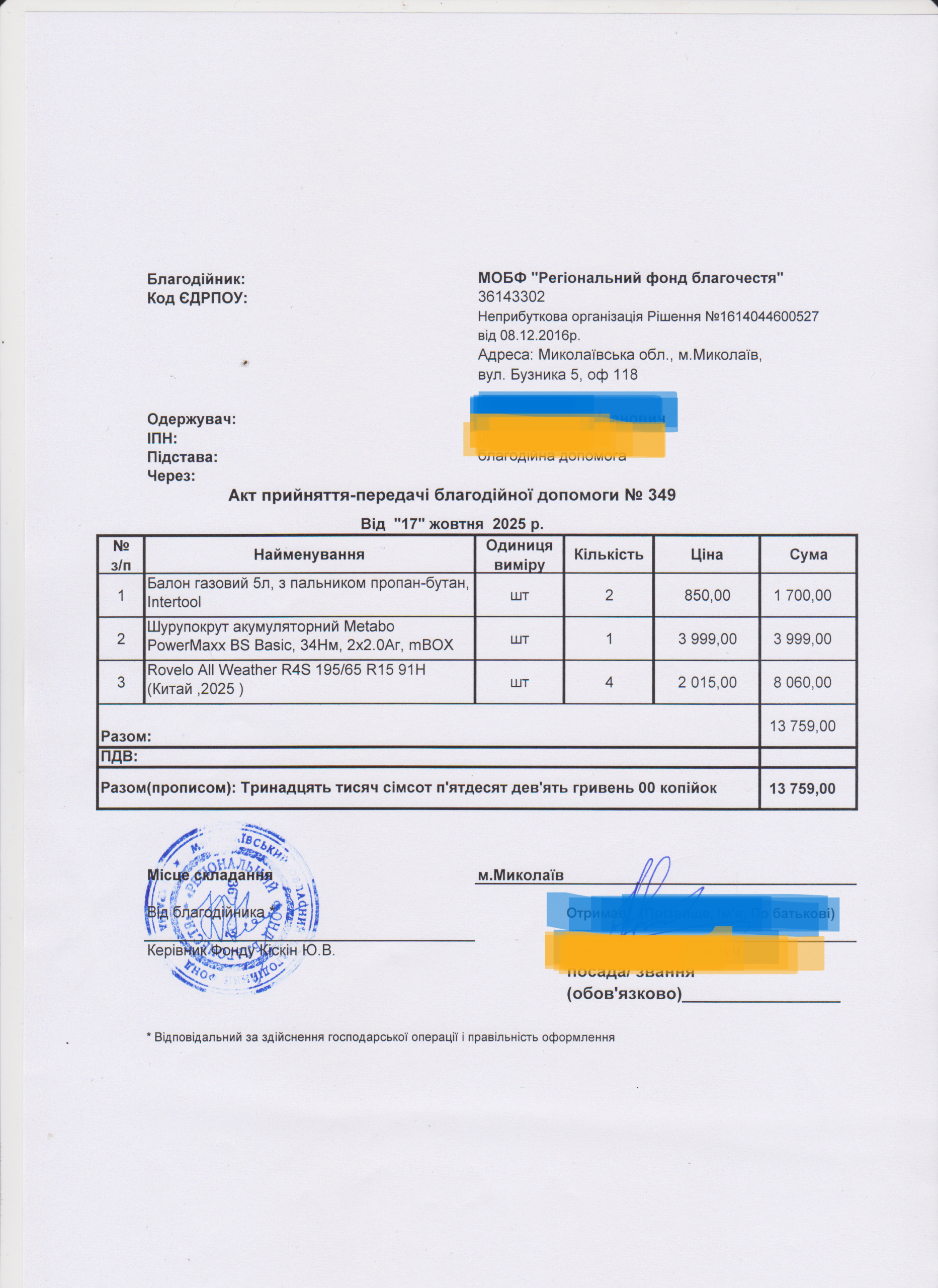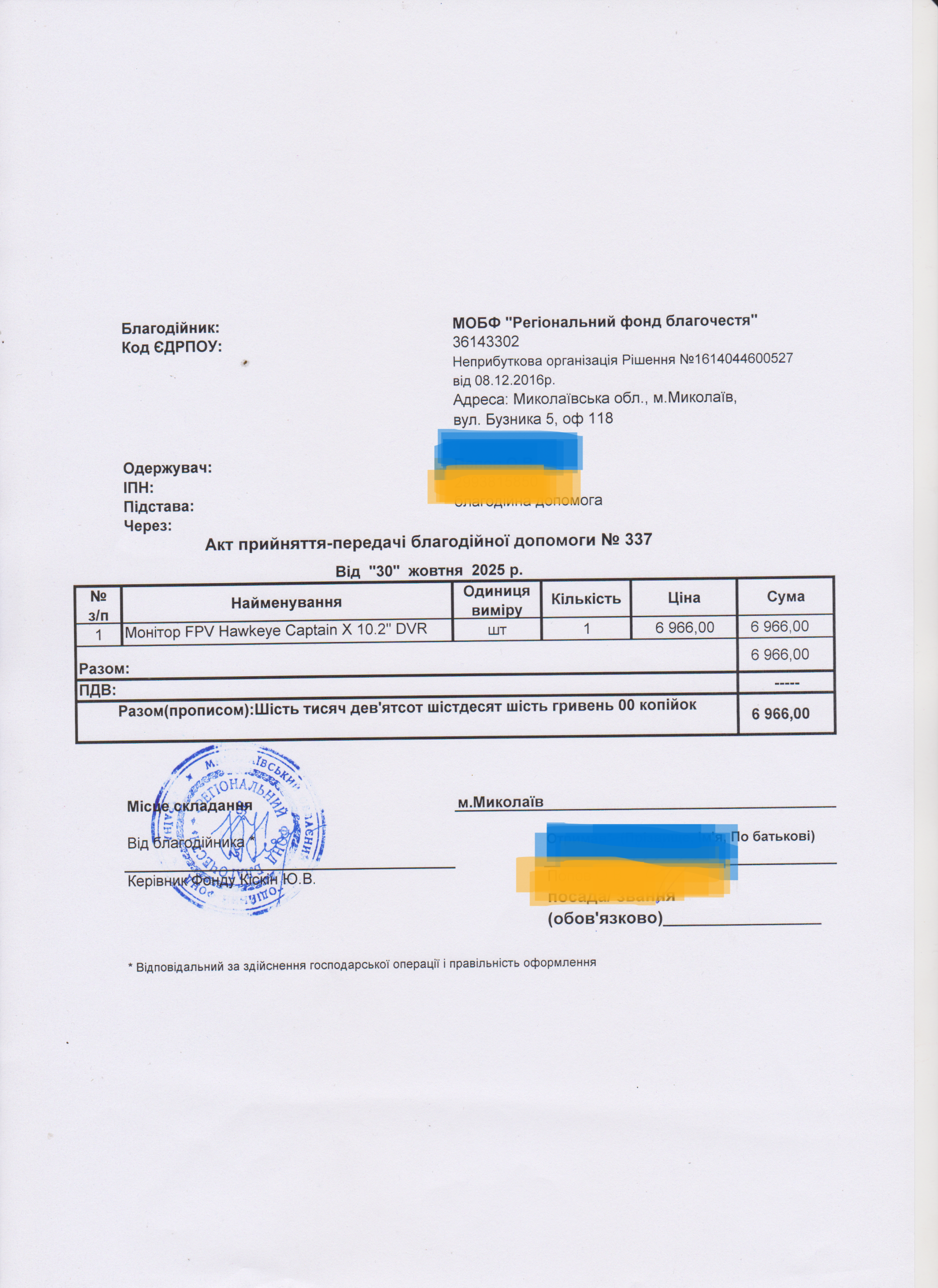 | 11/04/2024 | бронежилет | 1 | 12 850.00 | закуплено та передано |
