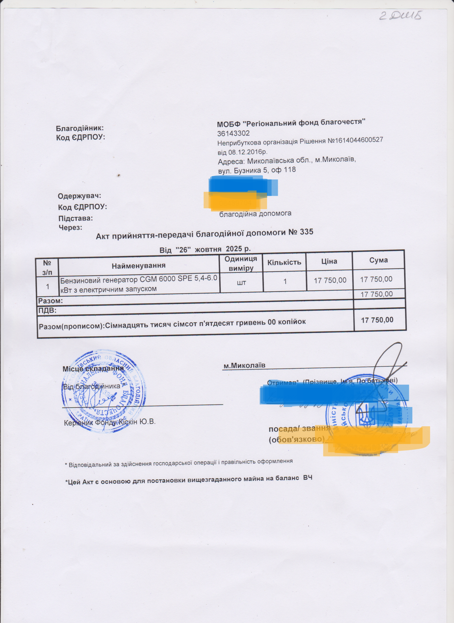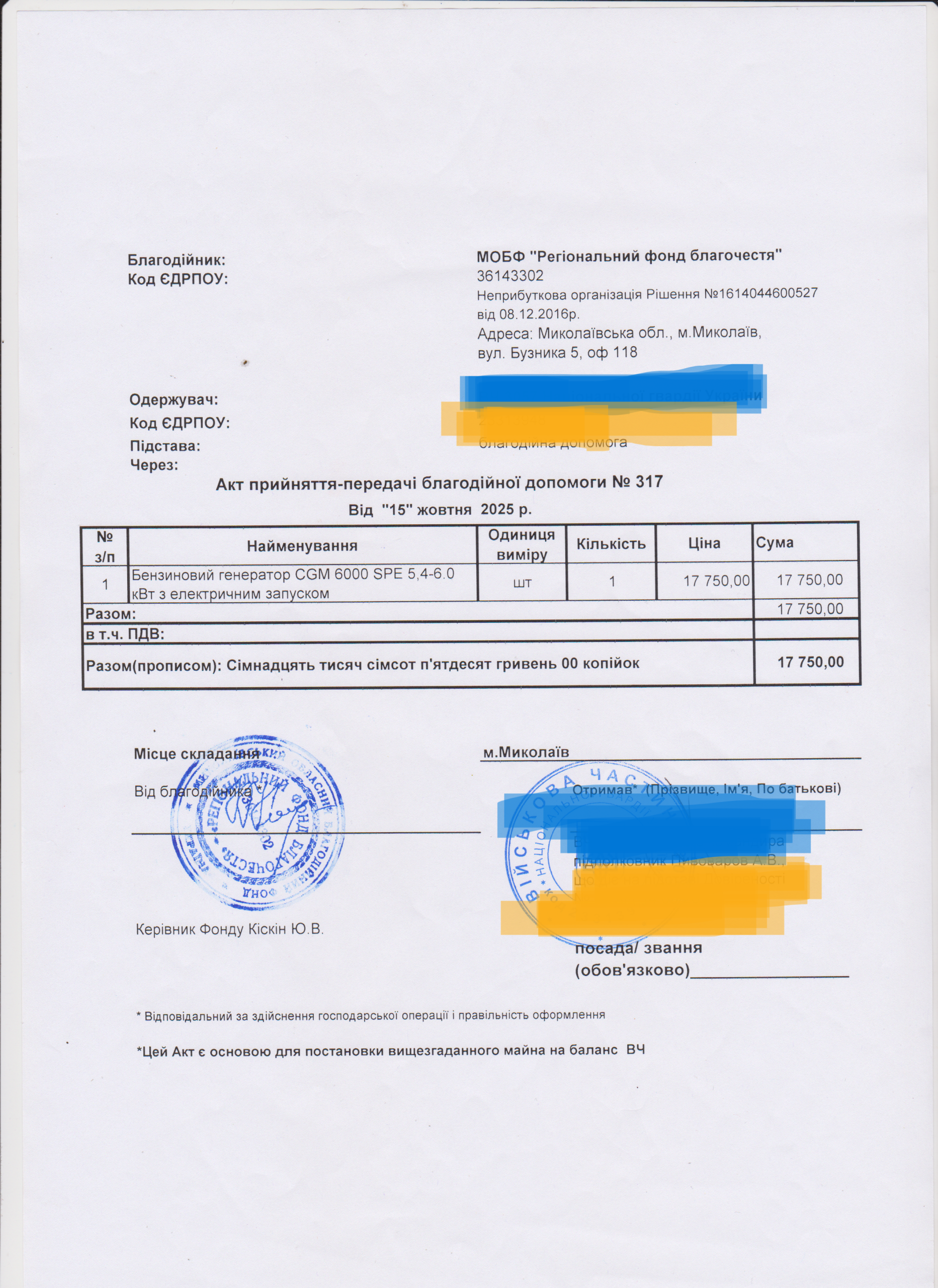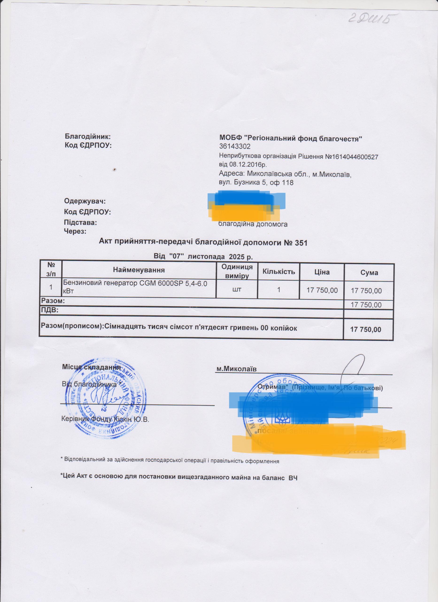 | 18/11/2025 | Генератор | 1 | 17 750.00 | Акт |