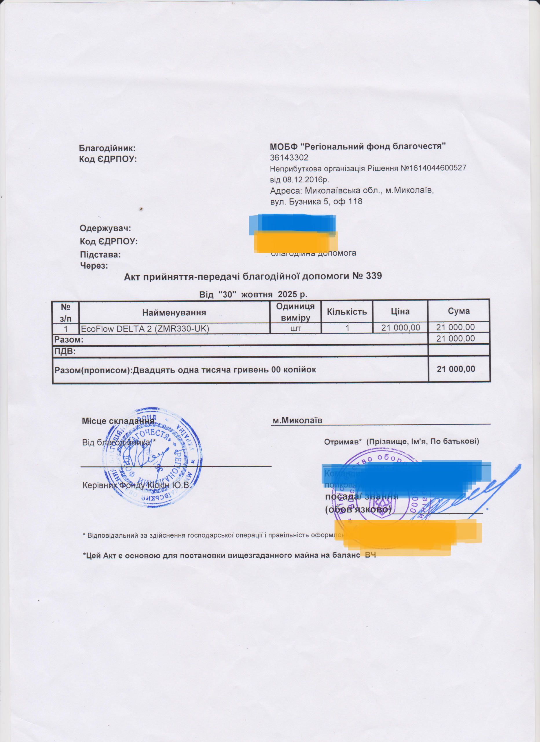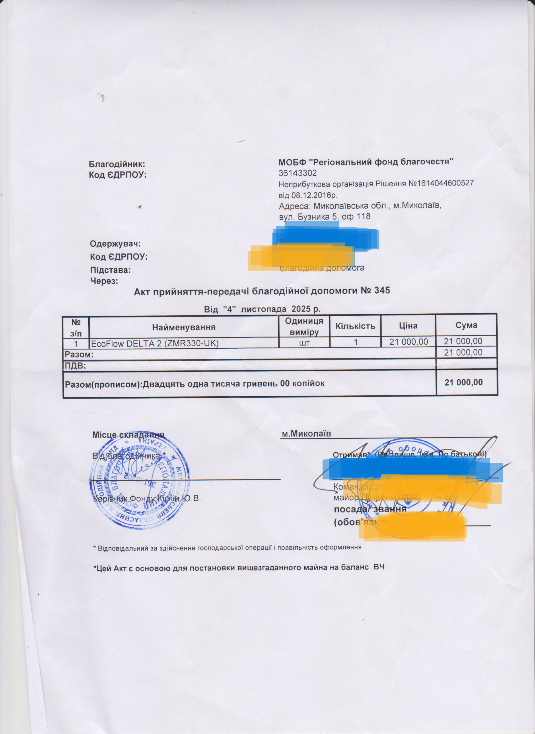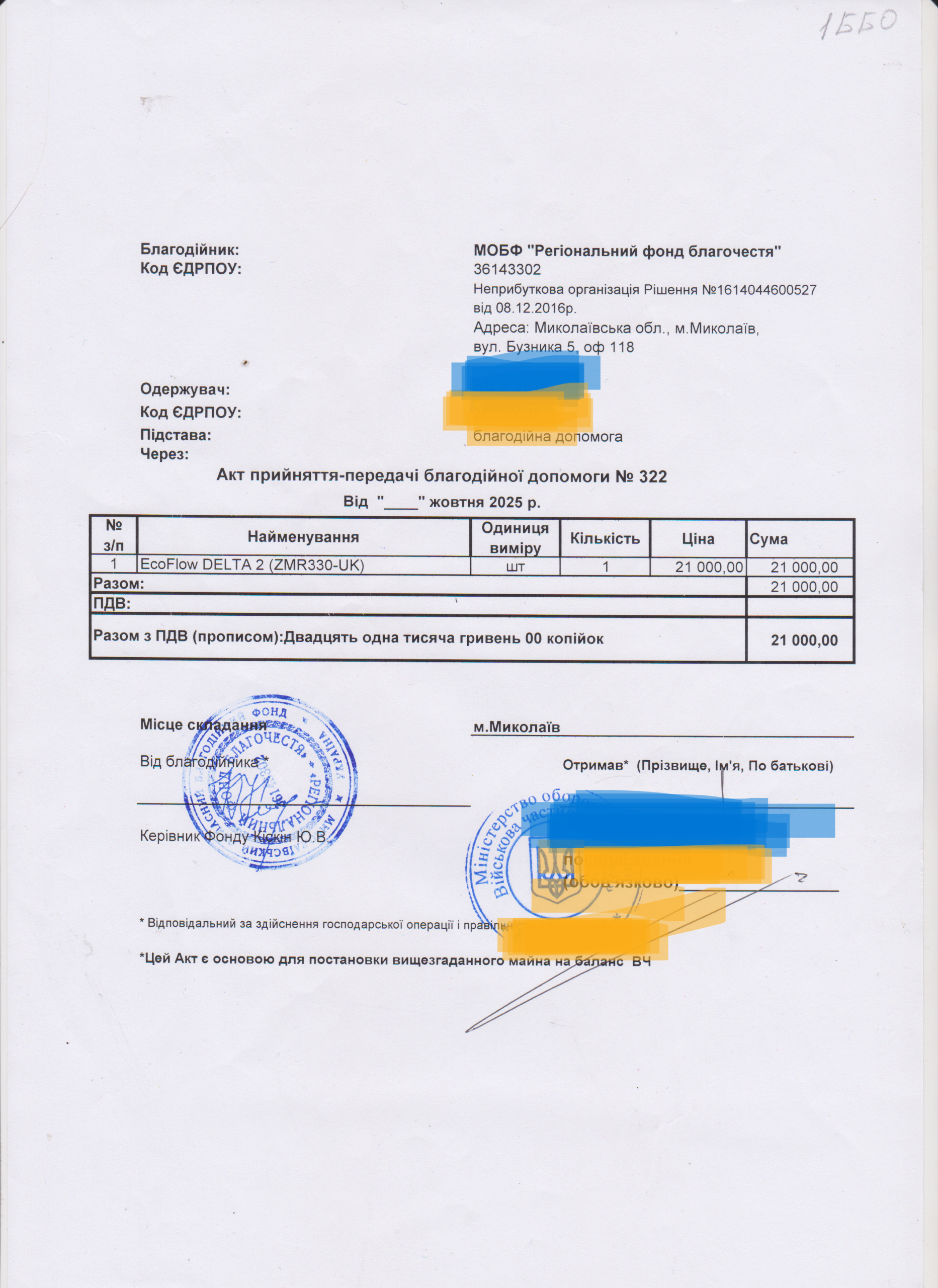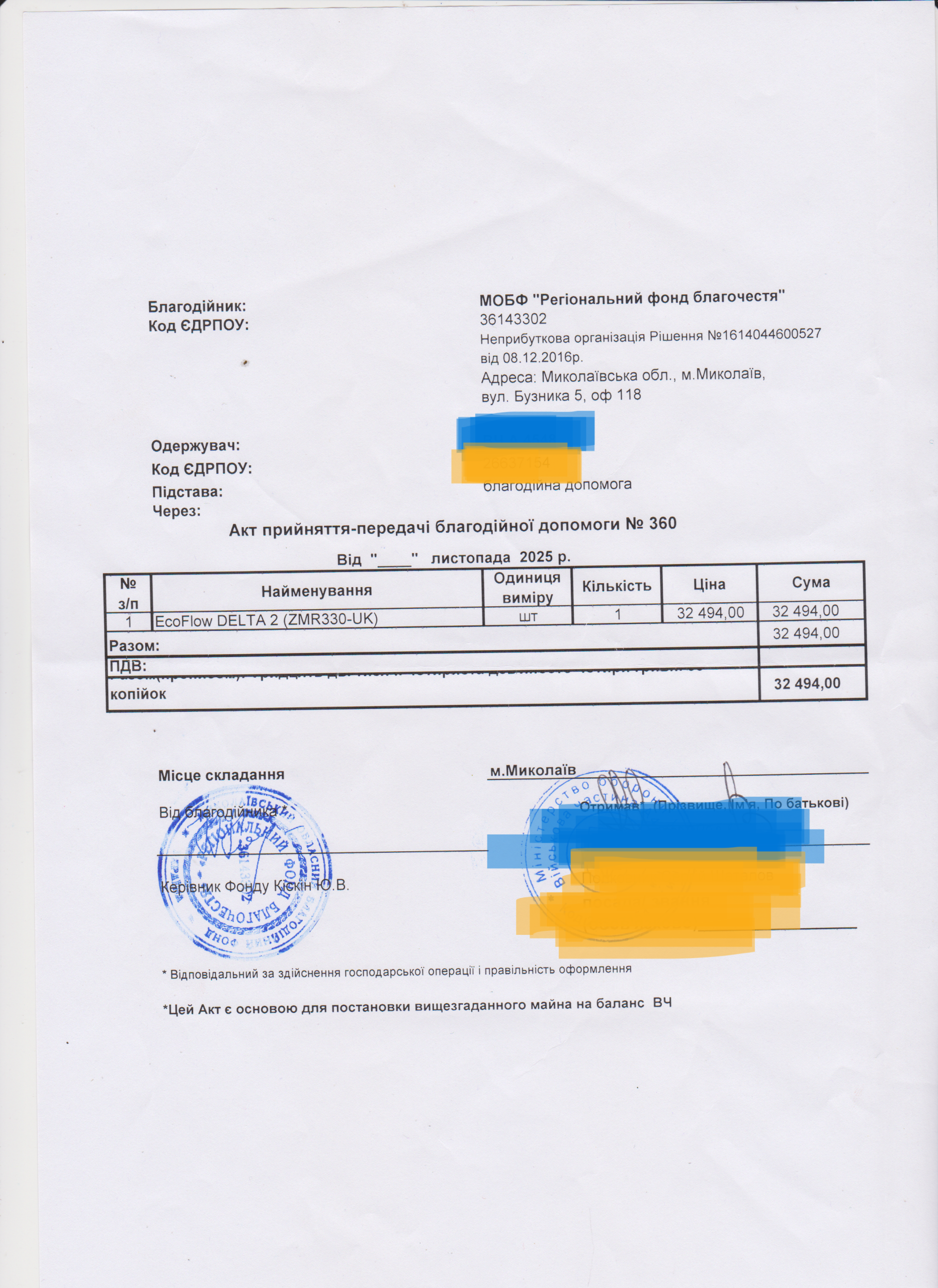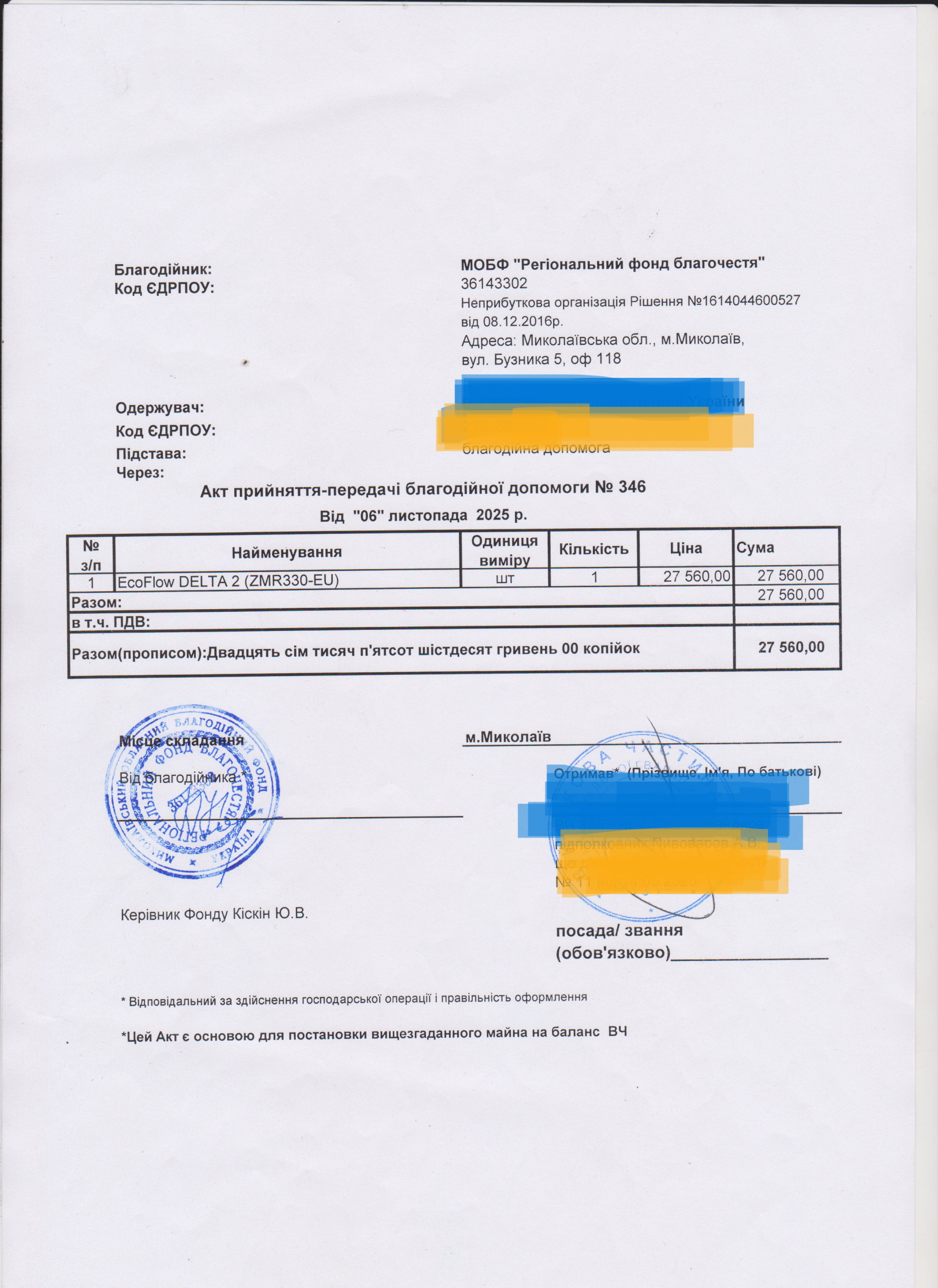 | 22/02/2024 | EcoFlow, прожектор | 2 | 55 949.00 | закуплено та передано |