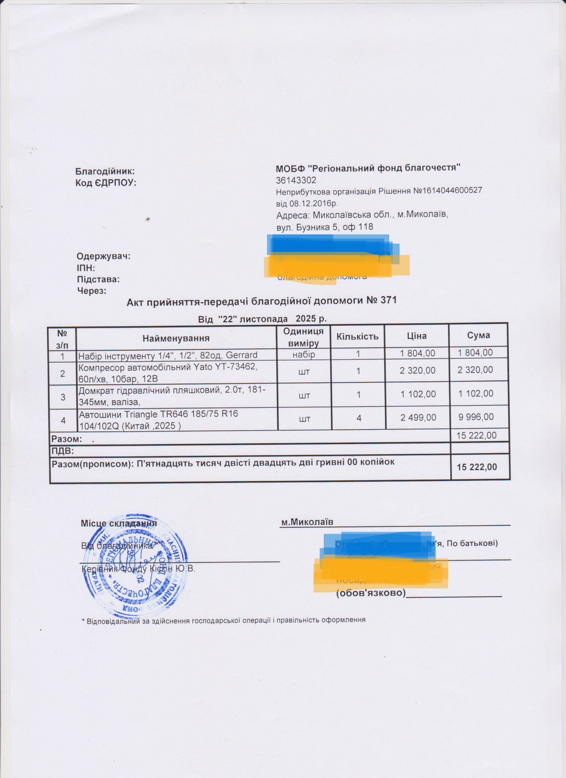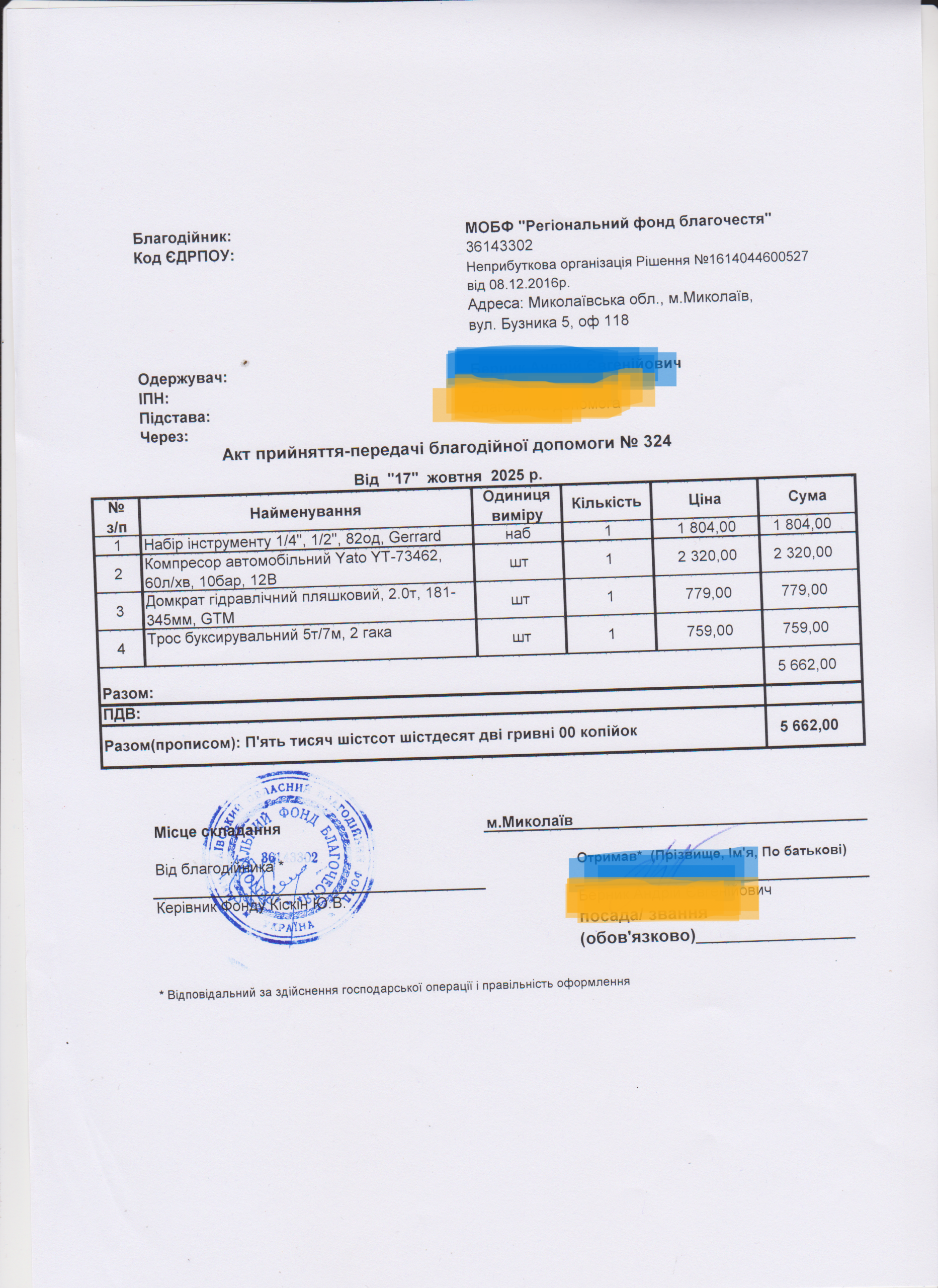 | 29/09/2025 | Трос, домкрат, набір інструментів, компресор | 4 | 6 480.00 | Акт |
