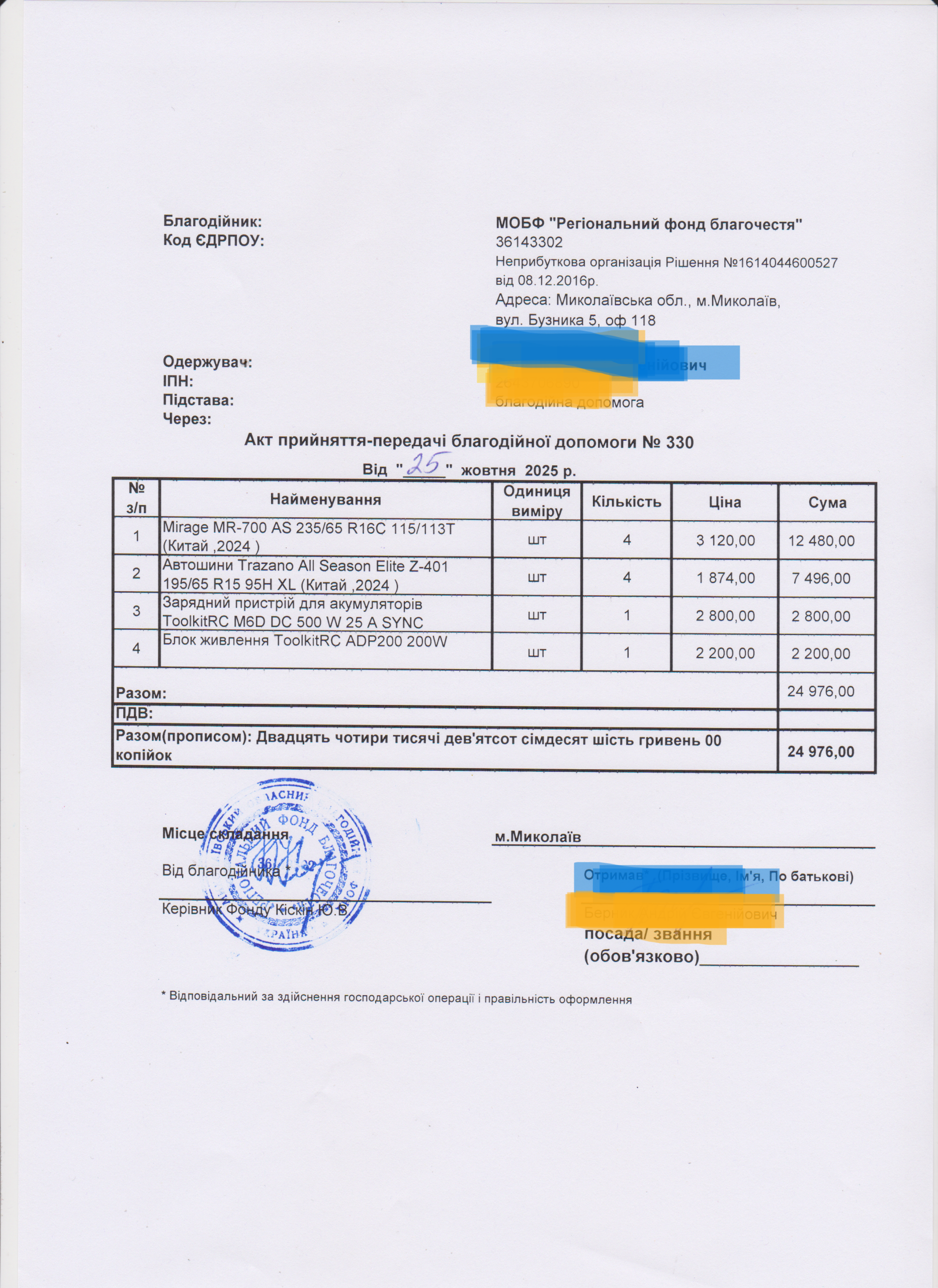 | 18/11/2025 | Шини, зарядний пристрій, блок живлення | 10 | 24 976.00 | Акт |