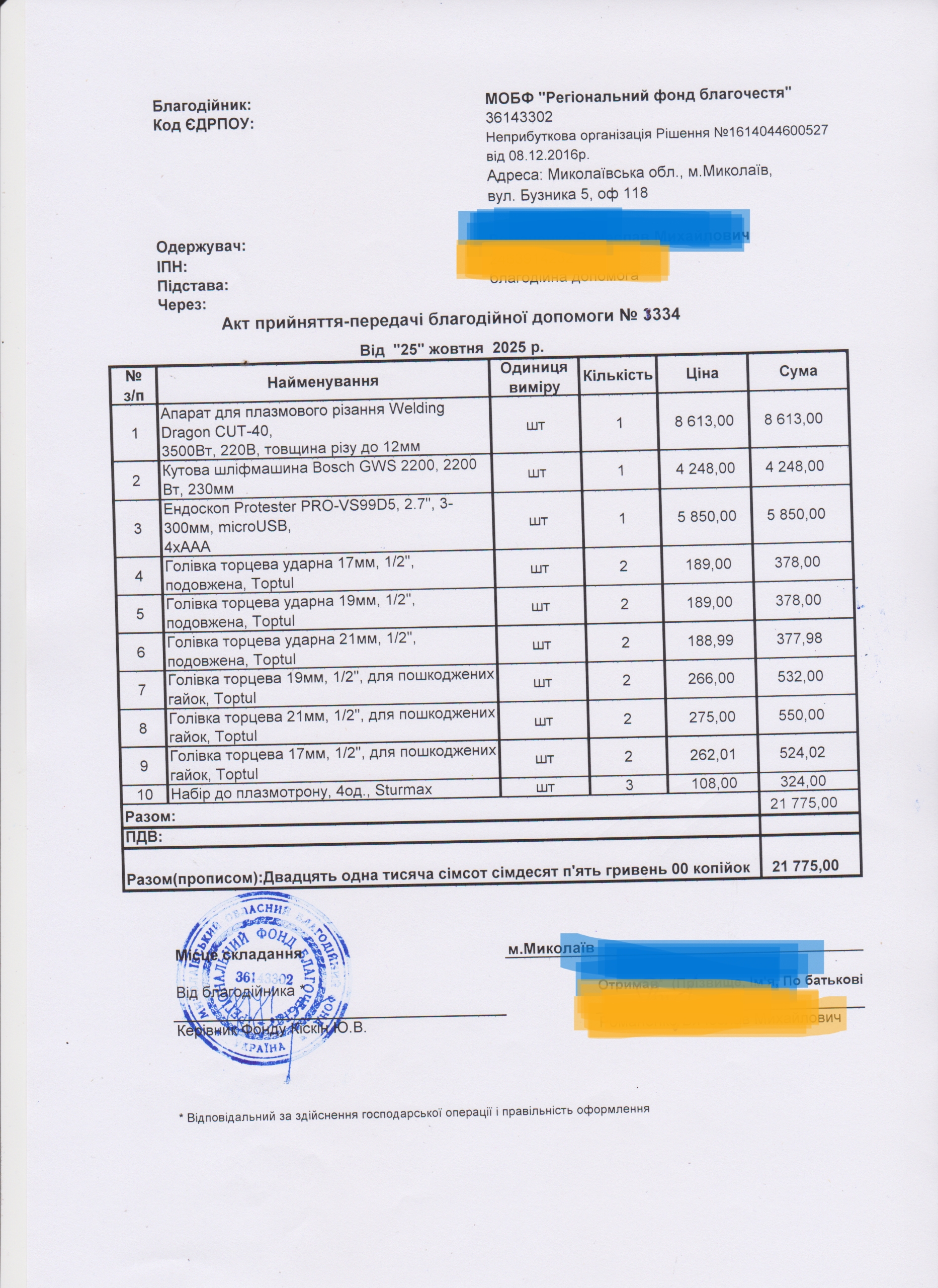 | 18/11/2025 | Інструменти, запчастини | 18 | 21 775.00 | Акт |