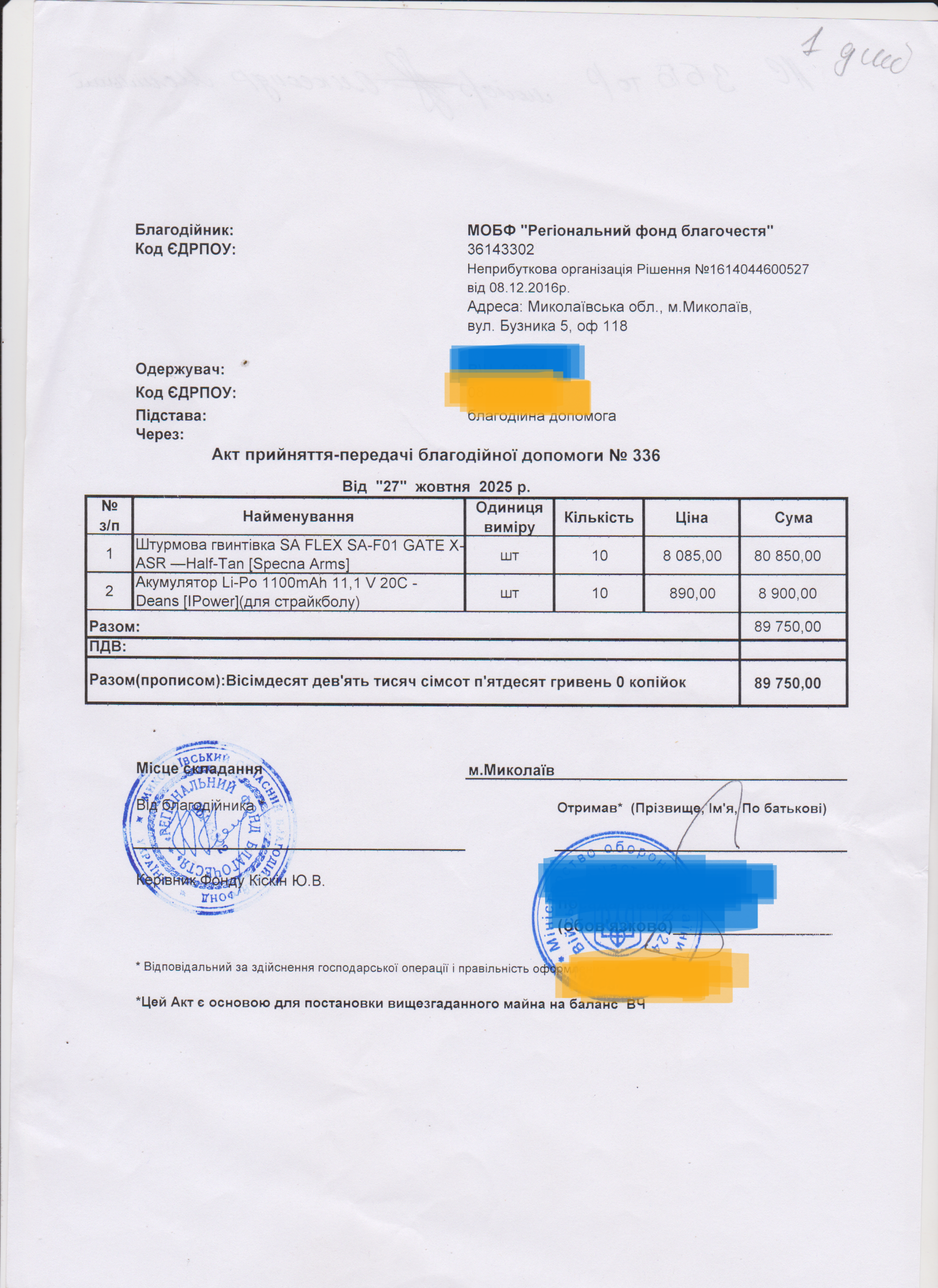 | 18/11/2025 | Гвинтівка, акумулятор | 20 | 89 750.00 | Акт |