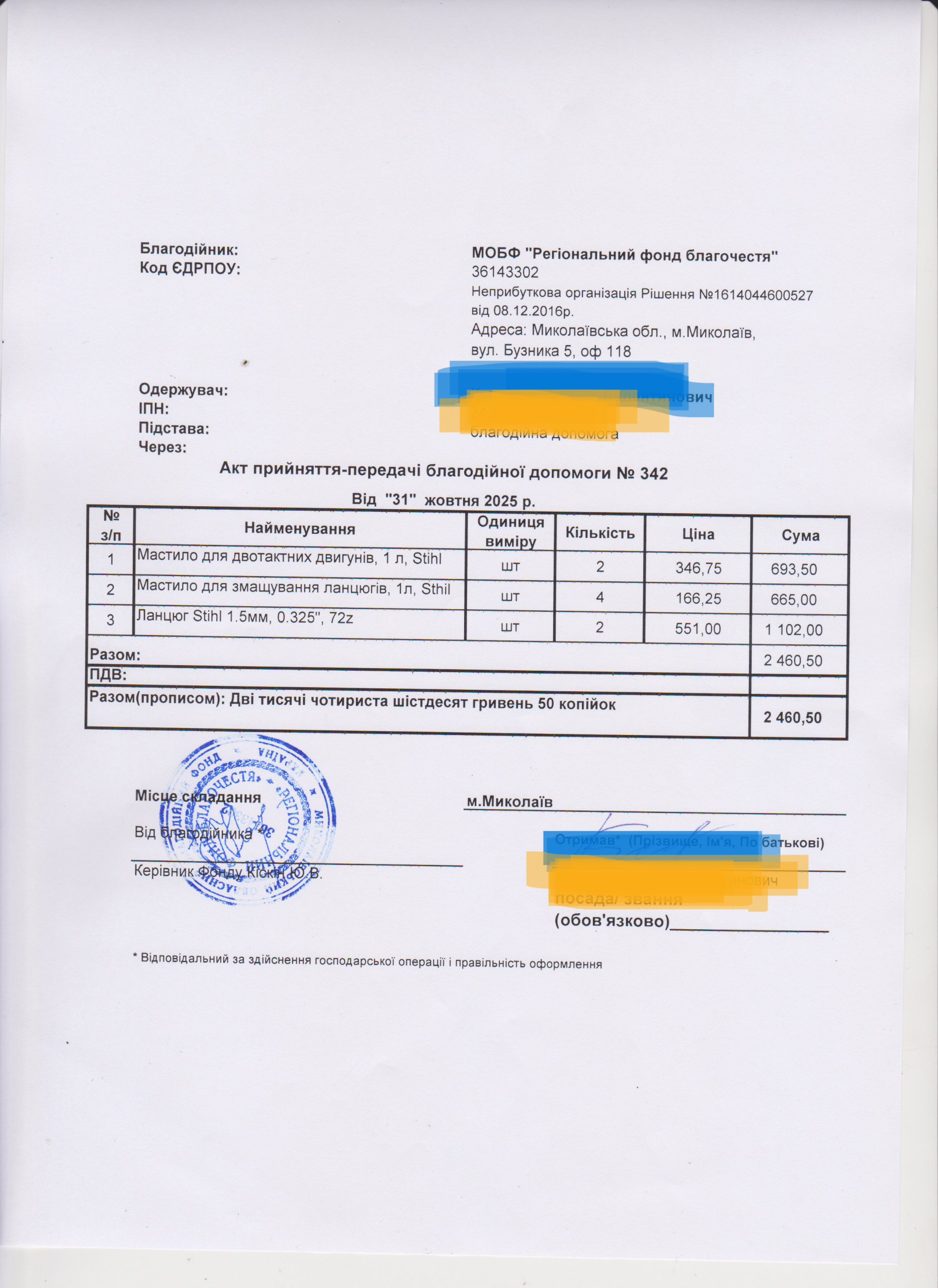 | 18/11/2025 | Мастило, ланцюг | 8 | 2 460.50 | Акт |