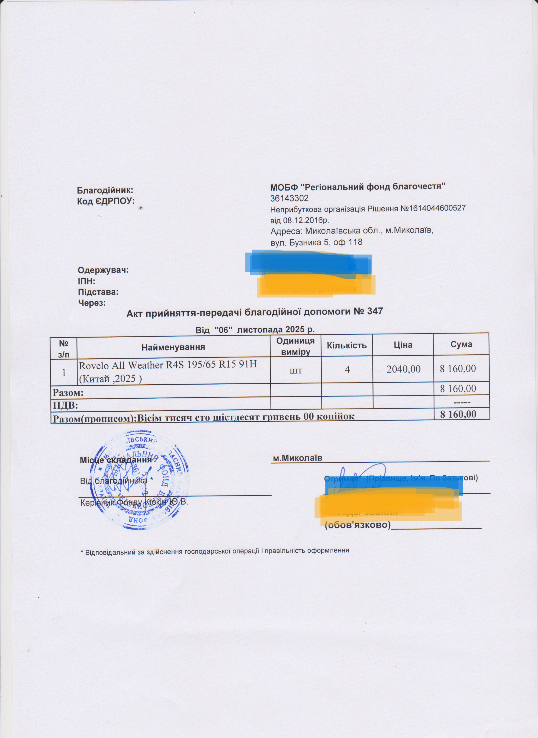 | 18/11/2025 | Шини | 4 | 8 160.00 | Акт |