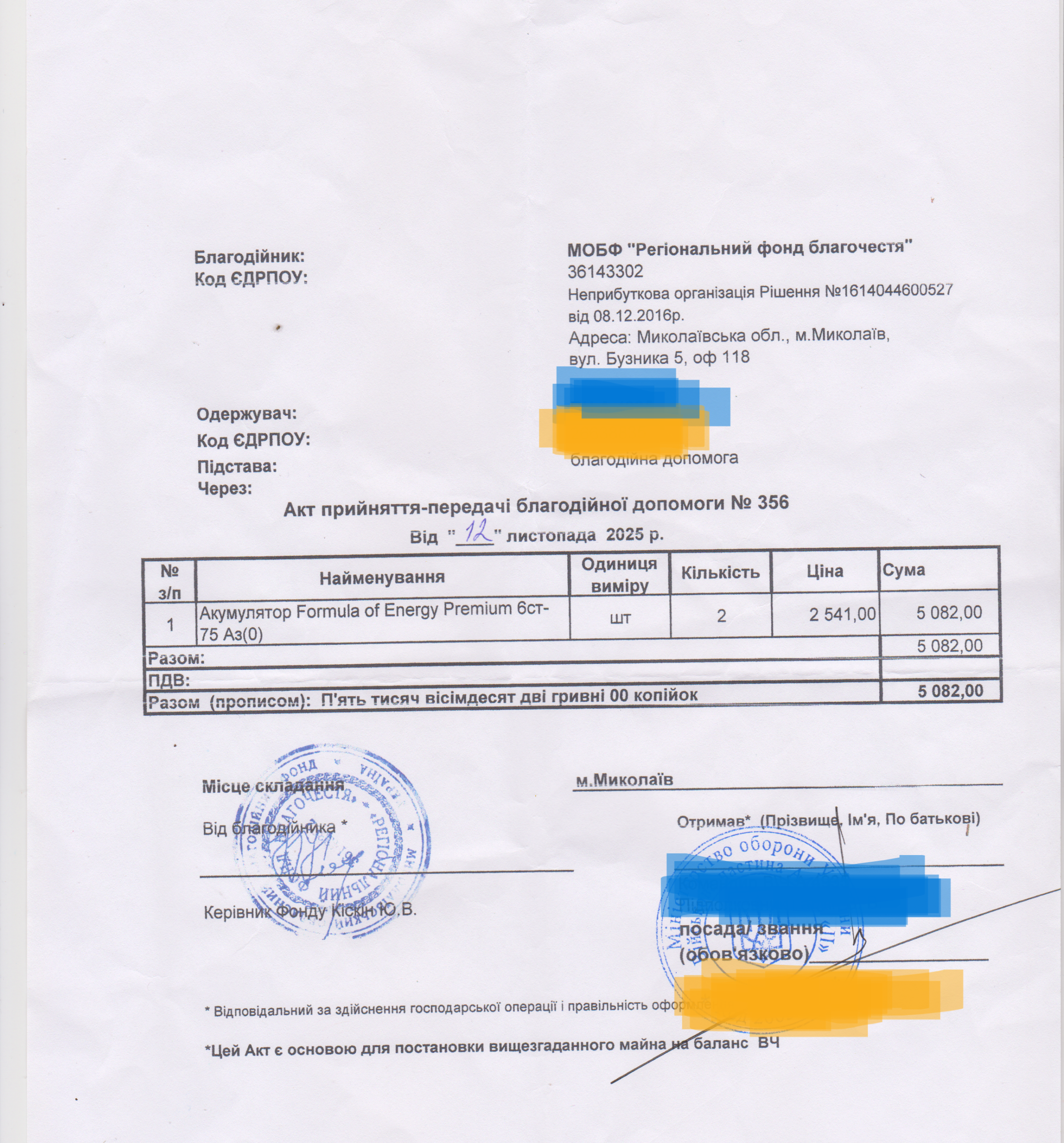 | 12/12/2025 | Акумулятори | 2 | 5 082.00 | Акт |