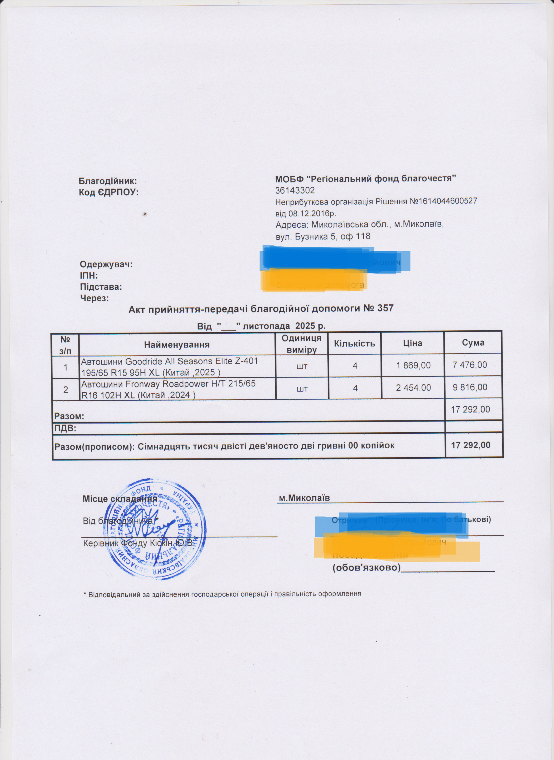 | 12/12/2025 | Шини | 8 | 17 292.00 | Акт |