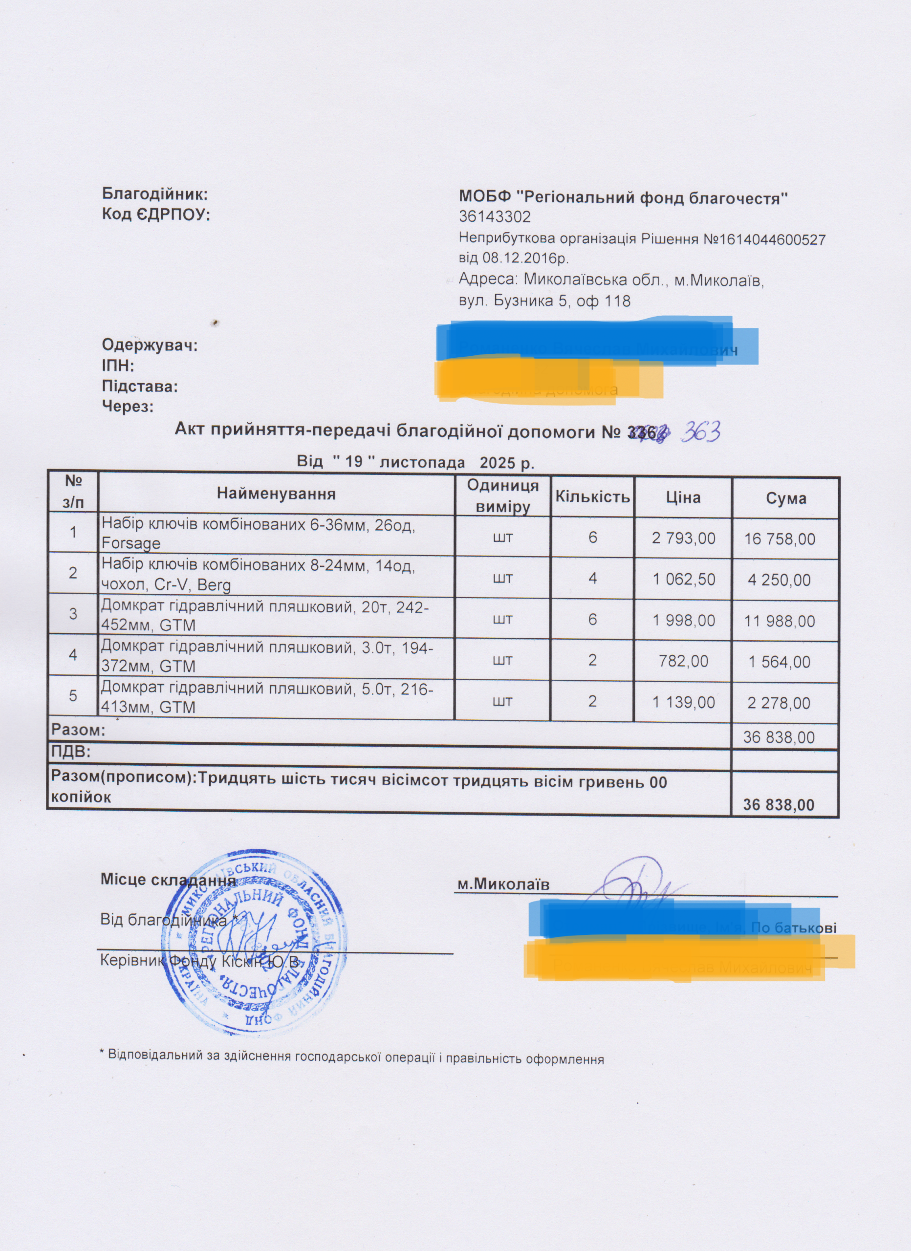 | 12/12/2025 | Набір інструментів | 20 | 36 838.00 | Акт |