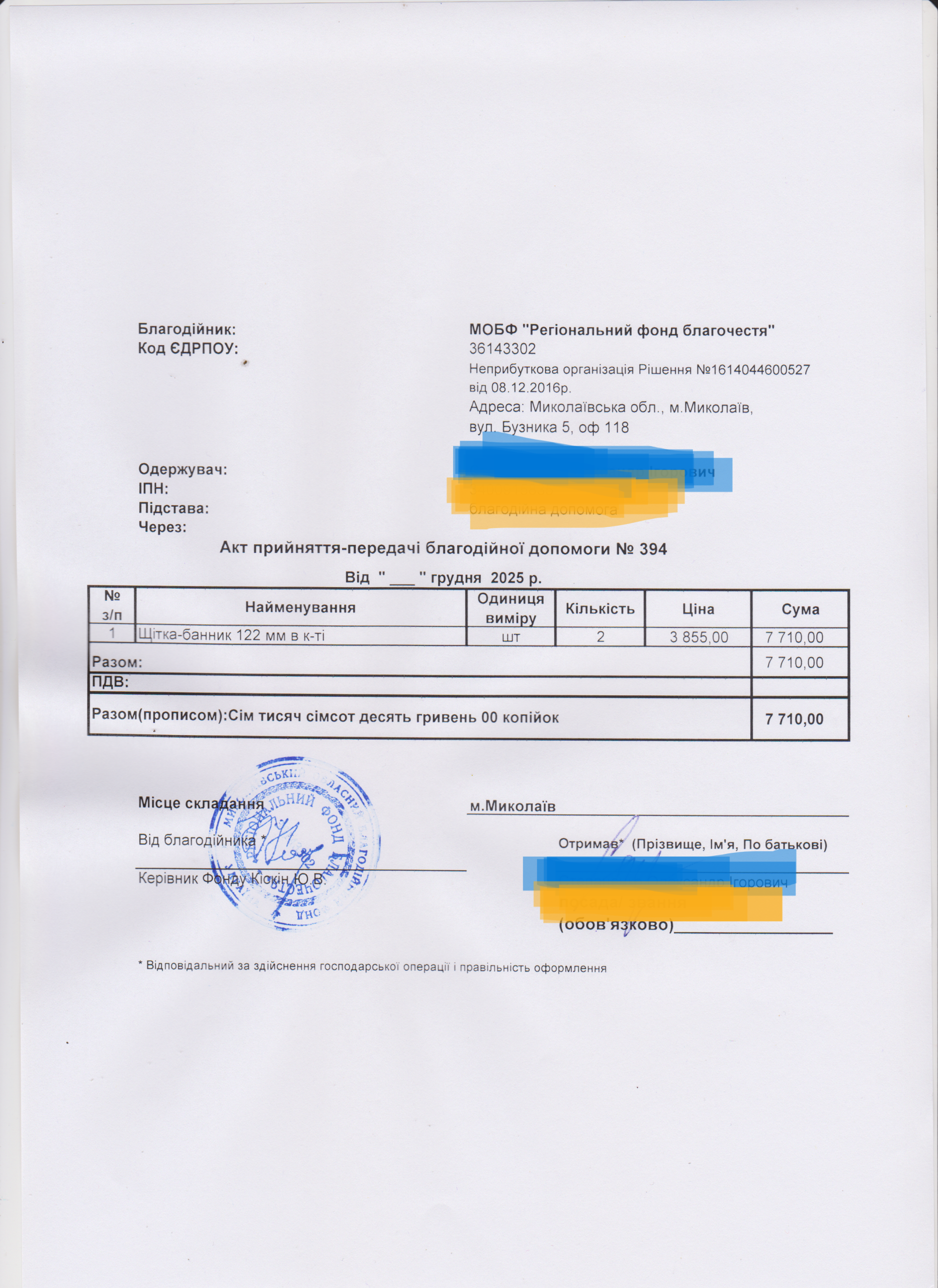 | 12/12/2025 | Щітка | 1 | 7 710.00 | Акт |
