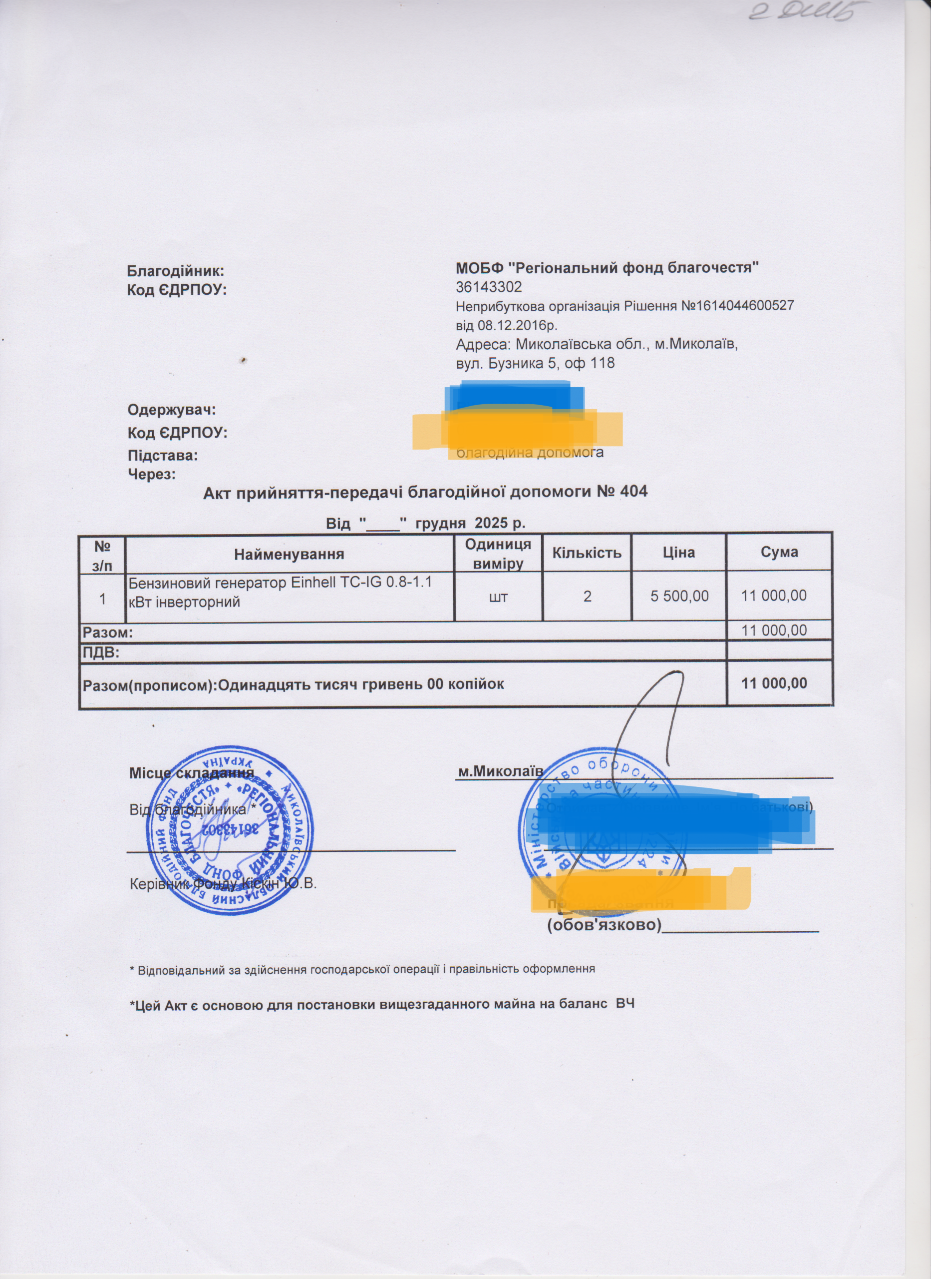 | 12/12/2025 | Генератор | 2 | 11 000.00 | Акт |