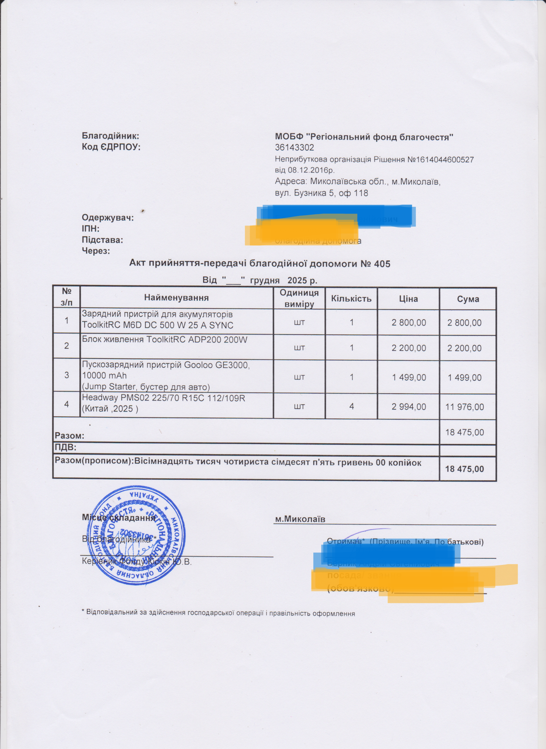 | 12/12/2025 | Зарядка, блок живлення, пускозарядний, шини | 7 | 18 475.00 | Акт |