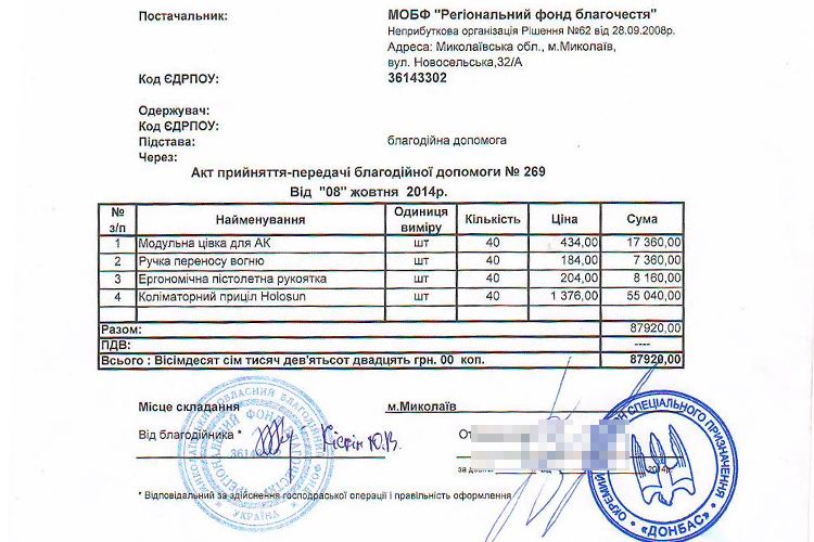 | 12/10/2014 | Коліматорний приціл HOLOSUN | 40 | 55 040.00 | передали проекту Допомога батальйону “Донбас” |