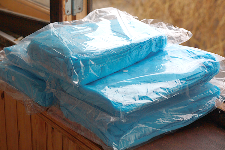 Ось уся партія цих халатів – загалом їх поки 200 штук. Найближчим часом дочекаємося на доставку респіраторів, і розвеземо вже все разом. Халати справді не ідеальні, одноразові – та це вже хоч щось. Буде на перший час, запас на зміну, доки дістаємо повні захисні костюми.