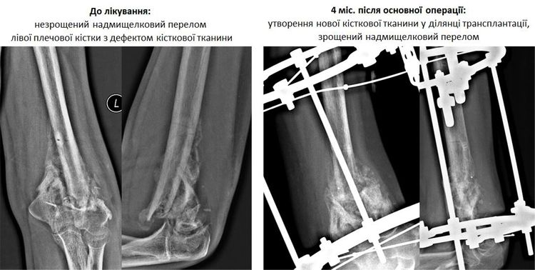 На знімку можна добре помітити утворення нової кісткової тканини у місці введення 3D-гелю з чипсами остеопластичного матеріалу та аутологічними стовбуровими клітинами, а також зрощений надмищелковий перелом.