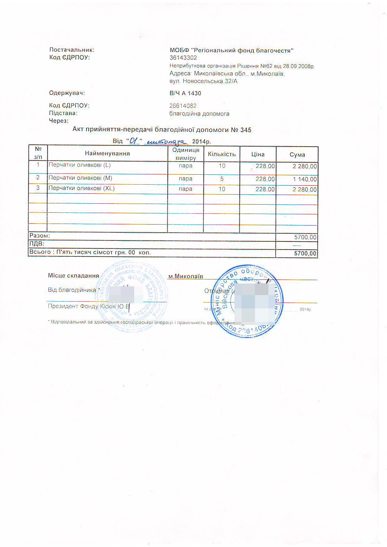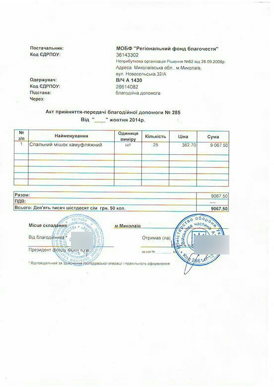 | 14/10/14 | Балістична захисна маска | 15 | 2550.00 UAH | Спонсорська допомога | |